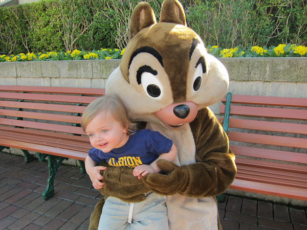 Right on the benches below the train station, there was no line for Chip (I checked, it’s Chip and not Dale). Well, there was one person, but that’s not a line. For the first time Theo actually went up to a character on his own for a picture. Big step there, buddy! It also enabled me to get a better picture on my own. That said, you might want to review my post on taking family pictures at Disneyland.