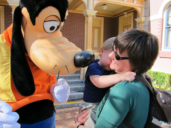 At this point Theo had been pretty much done for the day and we were on our way out anyway, but hey! Characters! Let’s take a picture! Sometimes this backfires. We did have to wait a few people to get to Goofy. I’d already nixed the Mickey shot because the line was too long but Goofy only had like 4 people in it. Unfortunately each person had like 36 cameras and wanted a dozen permutations of Goofy and the kids, Goofy and the one kid, Goofy and the other kid, Goofy and the kids and mom and dad, Goofy and the kids and mom, Goofy and the kids and dad, Goofy and just mom and dad, and so on and so forth.