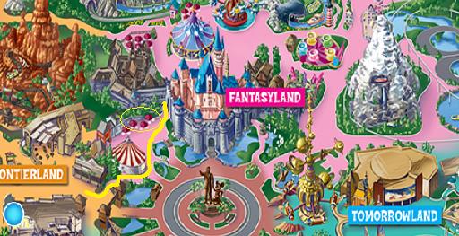 So when you’re heading North through the hub and cross the drawbridge, right as you come through the castle, look to your left and see the secret passage to Frontierland.