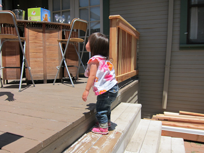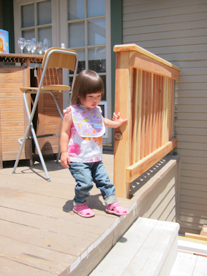 Our porch railing self-destructed at our last party (I know, you are seriously dying to come over now) so Kevin spent the week rebuilding it, only to find at every step that the damage underneath was much more than expected. Much like my fruit cutting, Kevin also ran out of time on the stair rails. And he has a much better excuse than spending 4 and 1/2 hours on a cake–he was actually working and making money. Anyway, we decided to just tell everyone to be careful on the stairs and have them sign a waiver coming in.