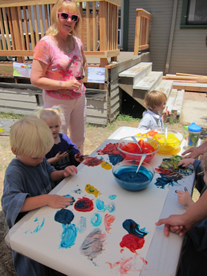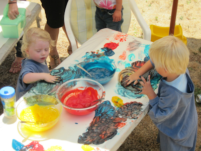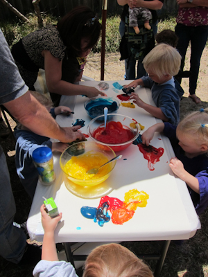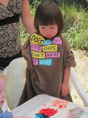 Then we got everyone into painting smocks for the next game. These are Daddy’s old t-shirts.