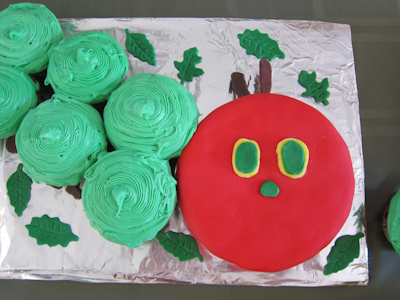 I don’t exactly have a background in cake decorating. In fact, before making the cupcakes I decided to go out and buy some real decorating bags and a tip. My college roommate Mary was in town so I dragged her out and we had no idea what we were looking for. I mean, we pretty much randomly just picked a decorating tip. But it turned out okay. The fondant I bought pre-made and I’m particularly proud of the caterpillar’s head.