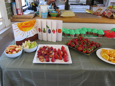 I also followed the book for the fruit spread. Because the cake took so long (4 and 1/2 hours!), I didn’t have time to cut the fruit, so my mom and Theo’s honorary grandma did all the fruit cutting for me. Which is basically like, come to my party and do my work for me. And enjoy yourself when you’re done. And here, have a glass of wine, which you brought.