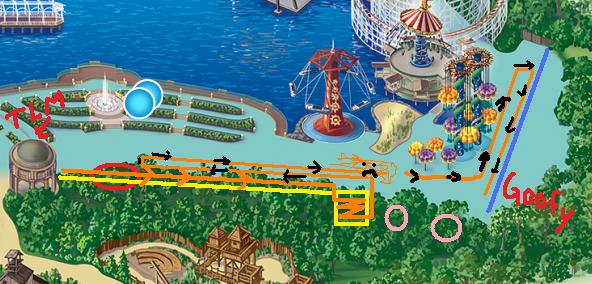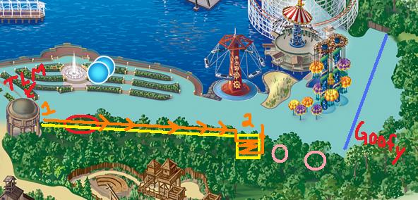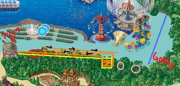 So on the map, the circle thing with the TLM and arrow is The Little Mermaid. The red circle is the stage, which I’ll get to in a second. The yellow line is the lighted walkway, roughly, and the square is the zig-zagging area. The two pink circles are the souvenir place and the Corn Dog Castle. And then there’s a wall and Goofy’s Sky School behind it. Basically all of those trees are a total lie.
