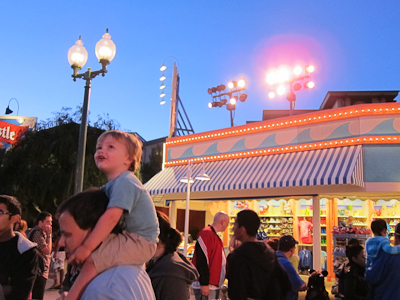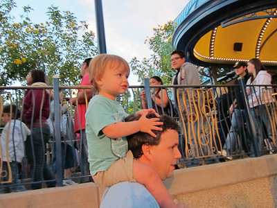 Then you get all the way down to the stage. Now this is a super, super, super cool part of the ride, because the boarding area is open and there’s a giant stage in front of it. I don’t know what they plan on doing on the stage but I did see a permanent industrial-grade bubble machine, and Theo really, REALLY likes bubbles.