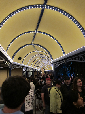 That’s the Grand Californian Hotel in the background, by the way. So after you twist and turn for a while, you feel like you should go right, which will bring you back to the lighted walkway and thus to the ride.
