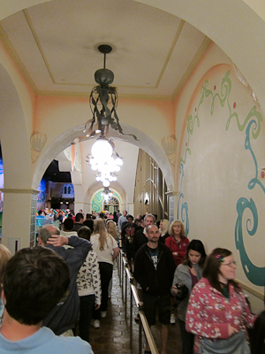 The nice thing about this ride is that it’s an Omnimover, which means it has a continuous load/unload, so as long as this line was, we never physically stopped moving. The second thing is that they made the shells nice and big–you can easily fit 3 people in there, 4 if you’ve got a couple of small ones. This is in stark contrast to rides with similar vehicles like the Haunted Mansion and Peter Pan, where 3 adults is a tough or impossible squeeze.