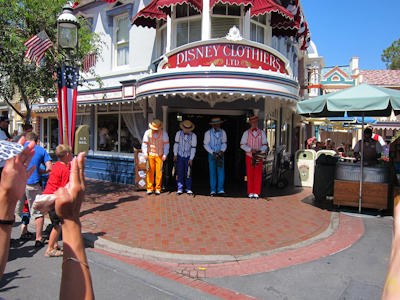 Walt loved music, so he planned a lot of it inside the park. Much like the Pearly Band, Bootstrappers, Hook and Ladder Company, and the Straw Hatters, the Dapper Dans is a barbershop quartet who appear to perform for a short while and then disappear. They sing a capella on Main Street, usually near the fruit cart. You can spot them by their natty outfits.