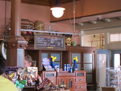 It also claims to serve candy (yes) and preserves (no). Like the rest of the stores on Main Street, there are some fun details if you look up.
