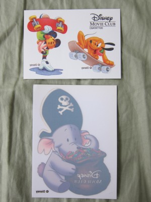Also from the Disney Movie Club, two tattoos (temporary) of Mickey and Pluto going all wild on their skateboards. Mickey is appropriately wearing his helmet, but you’ll have to have a talk with your child about how Pluto is a dog and doesn’t need his helmet but if I ever catch you riding a skateboard without yours you’ll never see the skateboard again, got it Mister? Also, there’s a pirate elephant decal! No safety lesson in that one.