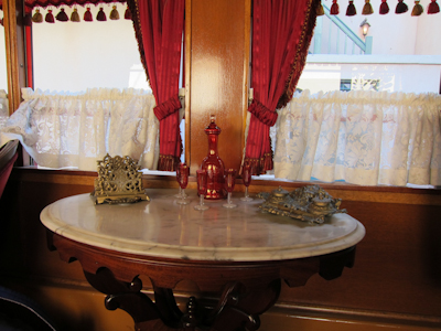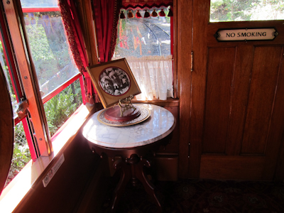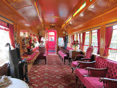 The Lilly Belle was originally a regular train car that had been taken out of service to make way for the cars where all the seats face sideways so you can see the Grand Canyon and Primeval World dioramas. In 1976, just in time for the bicentennial, Disneyland converted the Lilly Belle into a private train compartment for VIP guests. The car was decorated in a Victorian theme to match Walt’s apartment above the firehouse.