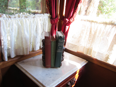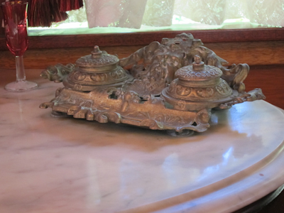 Kevin and I collect fountain pens and things that fountain pens rest on, particularly Victorian pen stands, so I couldn’t resist a closeup of the pen rest and ink bottles.