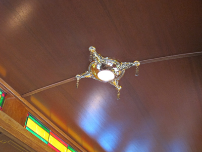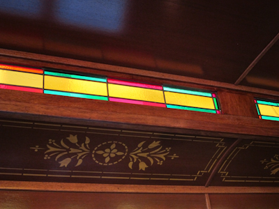 Gorgeous woodwork and stained glass run along both sides of the top of the car