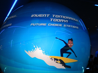 Once inside, you are immediately assaulted by the Wall O’Corporate Sponsorship. Now a lot of the attractions in the park are sponsored by corporations, but I can’t think of any more shameless than Innoventions. I mean, it’s like when a company buys a sports arena and changes its name. I’m looking at you Arrowhead Pond Honda Center and Compaq Center HP Pavilion. Anyway, Innoventions is very heavily sponsored.