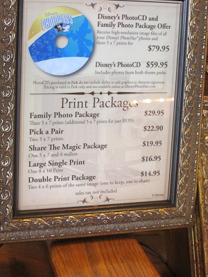 To translate, the Disney PhotoCD is $59.95. The prices on the bottom are for prints of various sizes. The package at the top is the PhotoCD and three 5×7 prints.