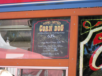 The Corn Dog Cart is found on the hub at the end of Main Street. The corn dogs are hand-dipped, which makes them delicious but also takes them longer to cook, so you end up with this: