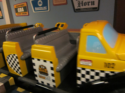 The cast member suggested my “little monster” might have the best view from the back seat, so  we climbed in and sat down. On the left of the taxi was a little screen.