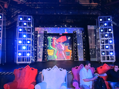 You can sit and watch the band in an oversized plastic chair in front of a decorative screen that used to be a show in ElecTRONica. I personally like the Mad T stage better.