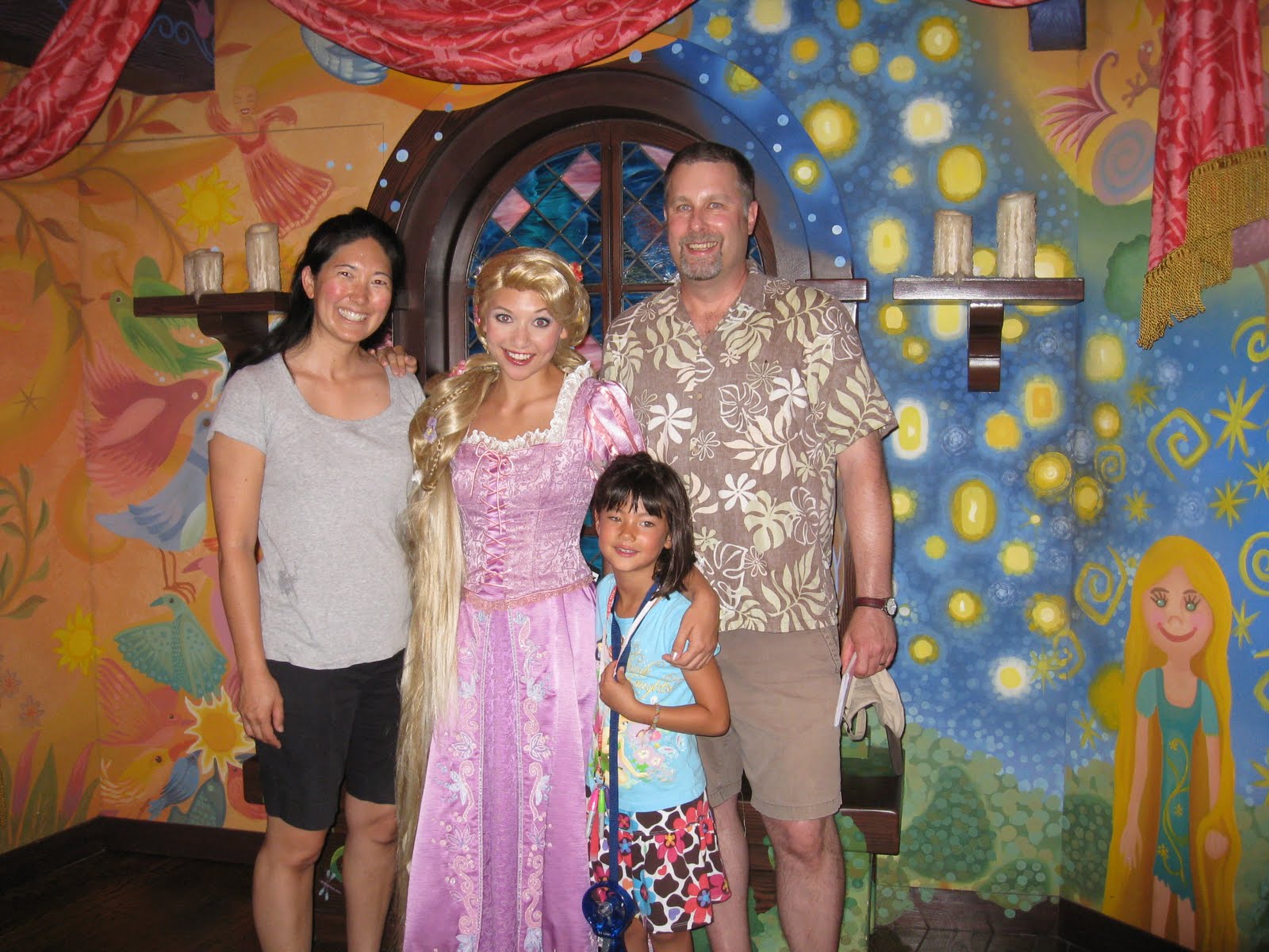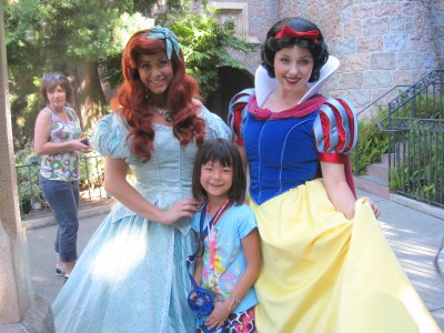 I have written in the past about the little secret passages that lead from either side of Sleeping Beauty’s Castle, one into what used to be Carnation Plaza on the way to Frontierland (which is now closed), and one to Tomorrowland via Snow White’s Grotto. In my tips, the secret passage is a great place to find surprise princesses, often with little or no waits. Well, apparently on Wendy’s trip, Marc left some stuff in the car, so Wendy and Sadie thought they would check out the secret passage to Tomorrowland and sure enough…