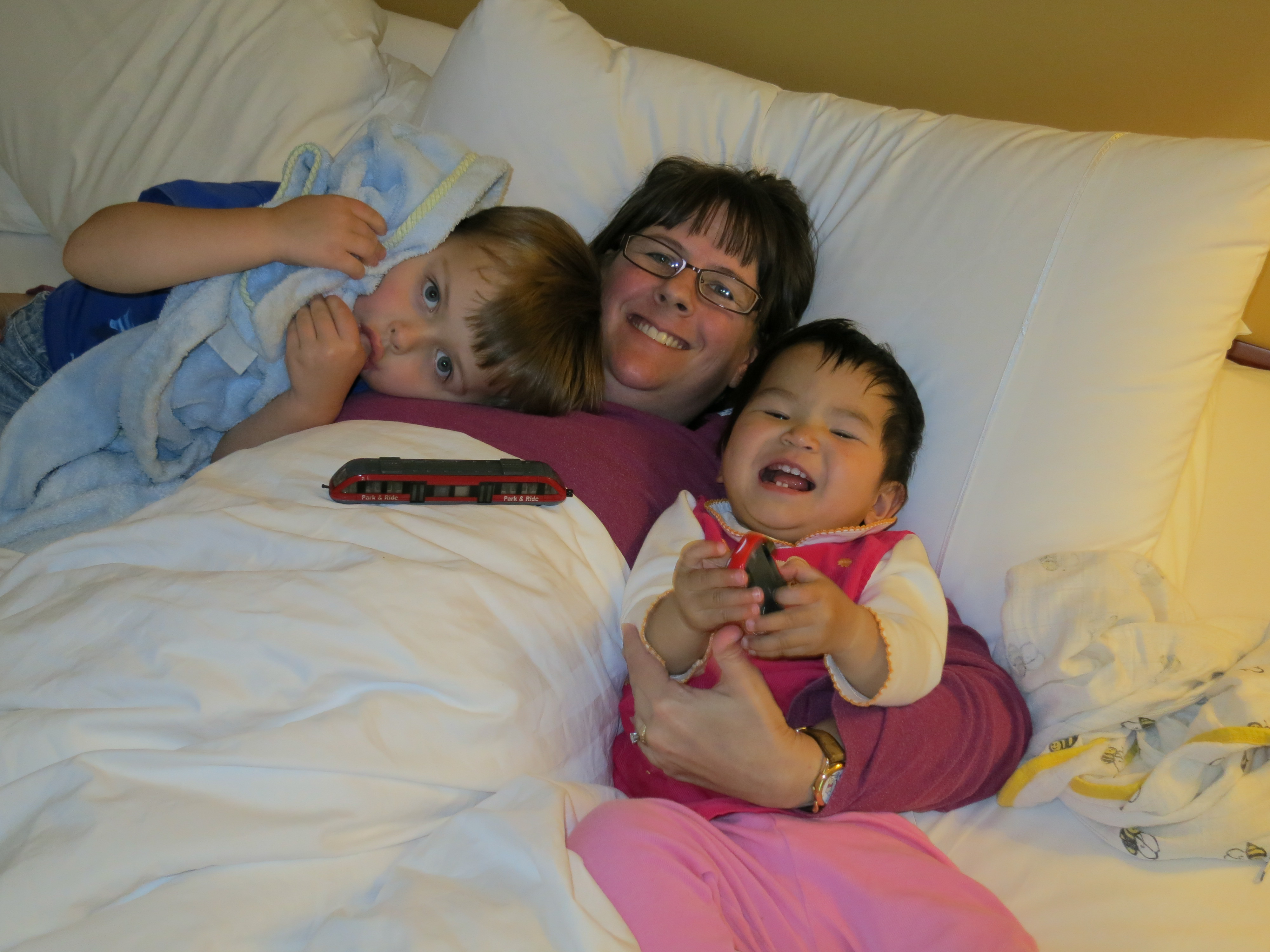 Snuggling in the hotel bed