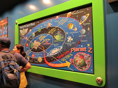 Then you hit the cool part of the line, which is the debriefing room. Buzz himself is there, larger than life (wasn’t he like really short in the movies? Shorter than Woody?), and his face is a hologram giving you more instructions.