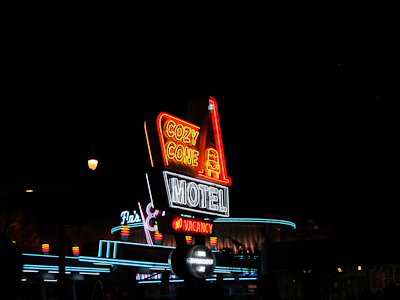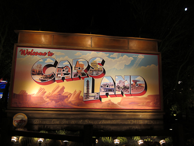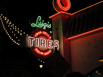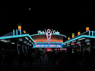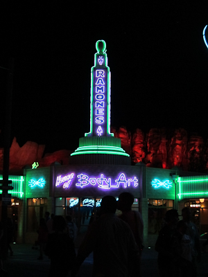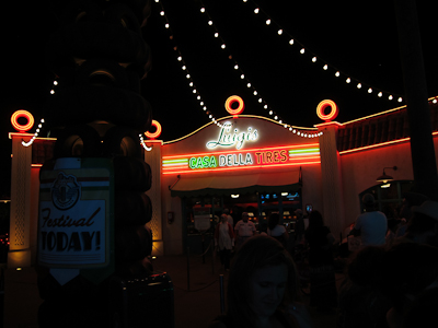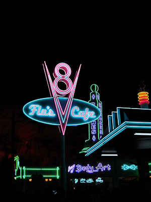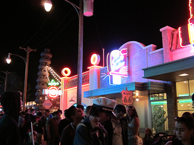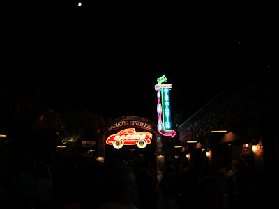 One of the coolest things about Cars Land is the way it looks after dark. Which makes sense, because in the movie they make this huge deal of sprucing up all the neon and such.