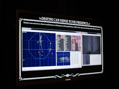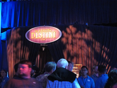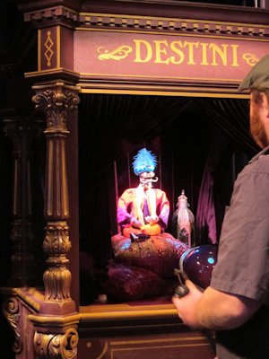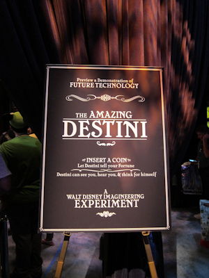 The Amazing Destini is a prototype of the latest technology in audio-animatronic figures. You had to wait in line to see Destini, so of course I did. He was a fortune teller in a booth and spoke to each person individually.