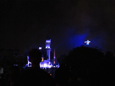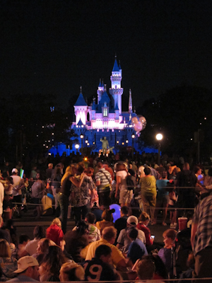 This summer’s fireworks show (it changes, btw) is called “Magical.” How convenient for my search for Disneyland Magic, hunh? Still looking for that–think fireworks may be part of it? I do. Anyway, there are many places to view the fireworks. In the past it didn’t really matter where you were in the park. Then on Disneyland’s 50th birthday in 2005, Disney pumped up fireworks to a whole new level. They closed parts of Fantasyland, brought in a lot of lower ground effects centered on the castle, and projected images onto the castle and Matterhorn. For that show, a spot in the hub (circle at the end of Main Street) was the ideal place to watch.