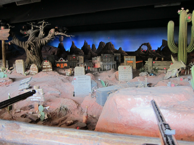 Like any shooting gallery, you aim at your standard Wild West scene. This one has large tombstones in the foreground and small houses in the back. I know that’s to visually create a sense of depth, but honestly it just kind of looks like the tombstones are freakishly large in proportion to the rest of this little town.